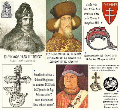 A propósito de vampiros y toda la ralea que vive de la sangre de otros y derrama la sangre para ofrendársela al que los controla, un lector nos indicó la existencia de este artículo del profesor rumano Constantin Rezachevici que estaba en el sitio barcelona.esoterismo.tripod.com en su versión en inglés. Lo tomamos y lo hemos puesto en castellano. En pre-gebelin.blogspot.com hemos hallado una breve información adicional. Así, este artículo ("From the Order of the Dragon to Dracula", Journal of Dracula Studies, Number 1, 1999), cuyo autor, Rezachevici, es el investigador principal en el Nicolae Iorga National Institute of History, miembro de la Academia Rumana y profesor en la Facultad de Historia de la Universidad de Bucarest, y autor de "La Historia de los Países Vecinos y el Pueblo Rumano en la Edad Media" (The History of the Neighbouring Countries and the Romanian People in the Middle Ages), publicado en 1998, este texto, decimos, hallamos que contiene información que se repite en Wikipedia (sitio que nombra como texto de referencia a barcelona.esoterismo.tripod.com) si se buscan noticias sobre la Orden del Dragón (en distintos idiomas). No creemos que el profesor Rezachevici juegue con su prestigio, de modo que o han bebido de fuentes comunes o es cierto, según dice un amigo nuestro, que Wikipedia no es más que un mar de piratería. Como sea, hemos notado con extrañeza que en la versión en inglés dice claramente que el símbolo de la húngara Orden de San Jorge es una cruz roja sobre campo de plata, siendo que la verdad es exactamente al revés (cruz de plata sobre campo de gules) según pudimos comprobarlo. Lo consideramos un error de transcripción del rumano al inglés (si el original fue escrito en rumano), y lo hemos corregido en consecuencia. Este breve ensayo es interesante por el deslinde filológico del famoso nombre de Drácula y por algunas informaciones generales. Esperamos que sea de algún provecho.
